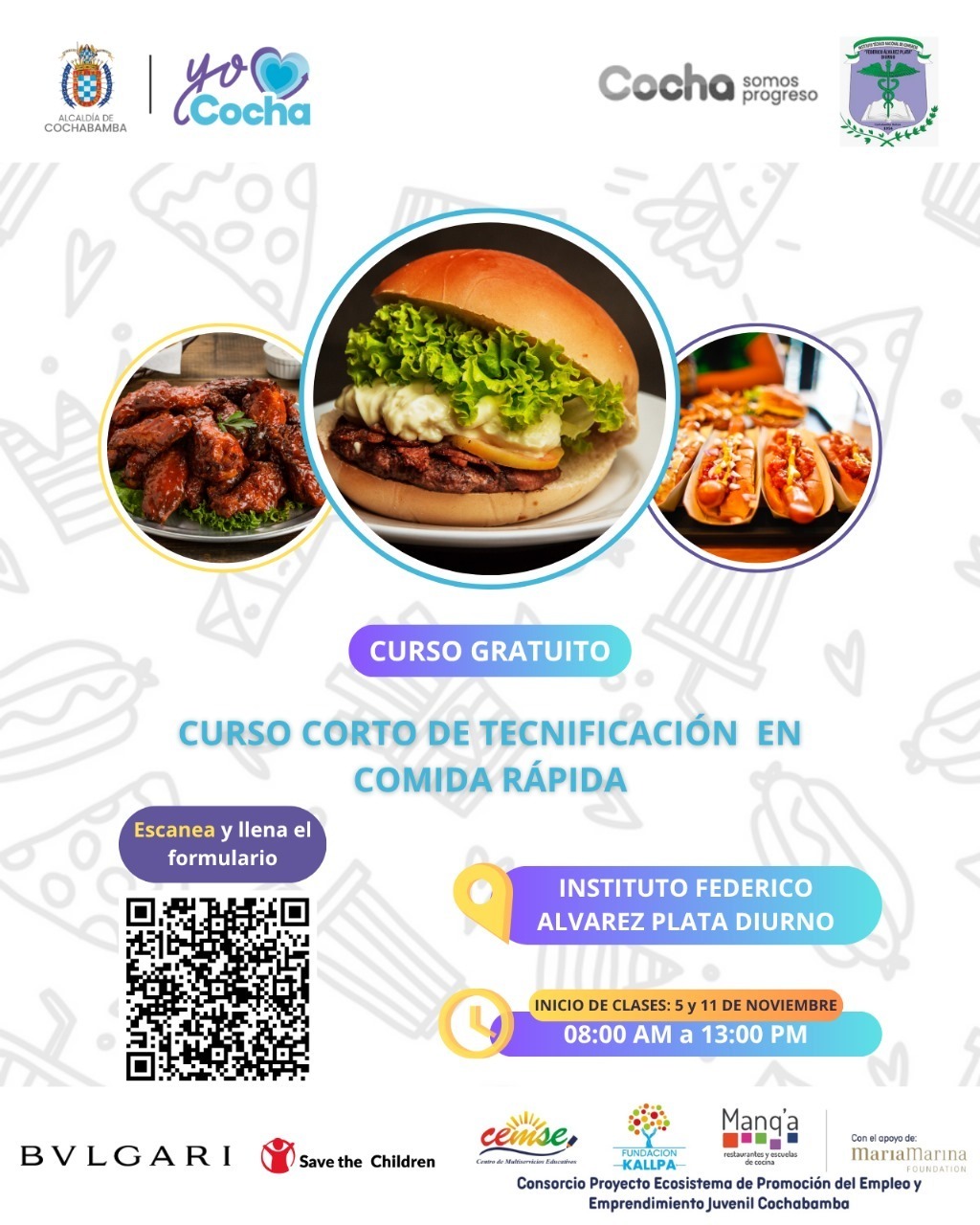 ¡Aprende a preparar comida rápida con técnicas profesionales y aumenta tus oportunidades de conseguir trabajo! Inscríbete al Curso Gratuito de Tecnificación en Comida Rápida y adquiere habilidades que te servirán para trabajar en emprendimientos, restaurantes o negocios propios.